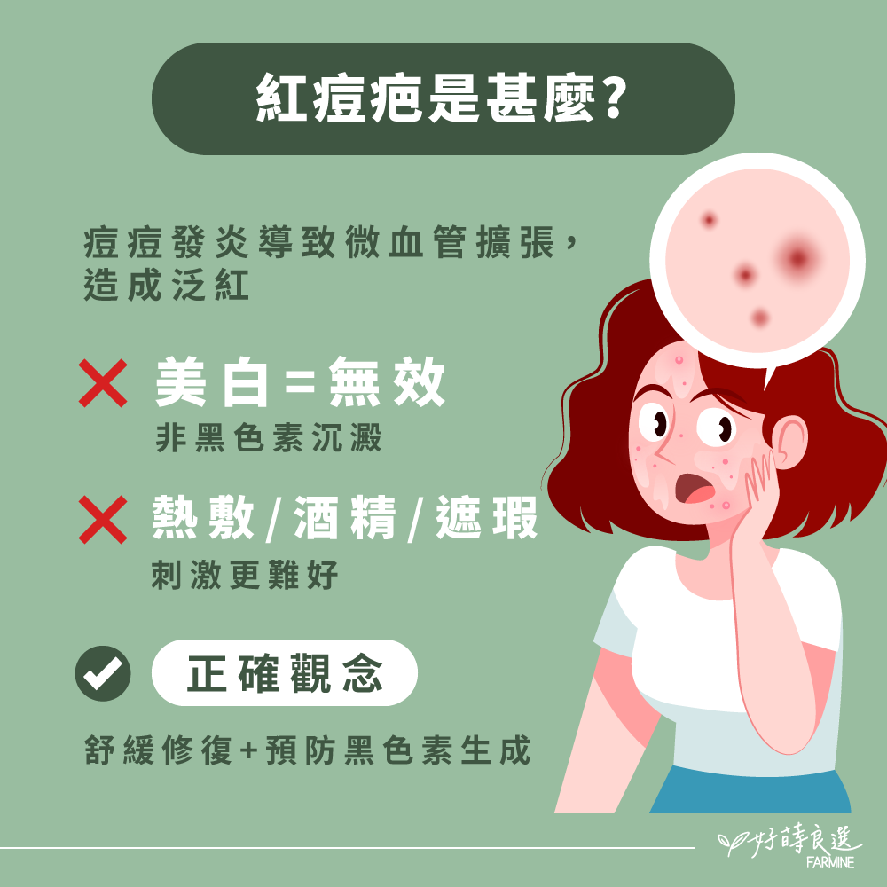👉 想改善紅痘疤,不能只靠「美白」,而是要鎖定鎮靜、修復與預防黑色素生成。
