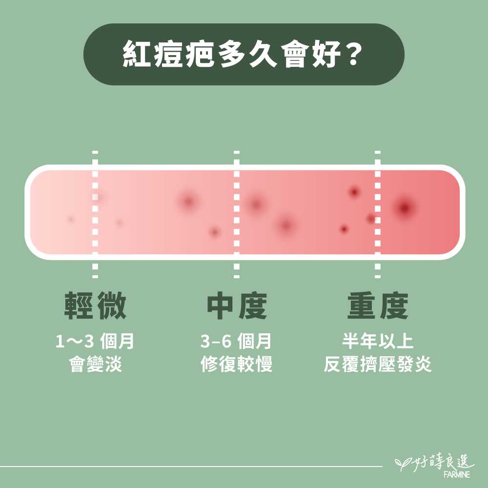 隨著皮膚的修復,擴張的微血管會恢復正常,紅痘疤也會逐漸淡化。時間長短,取決於發炎程度與生活習慣: