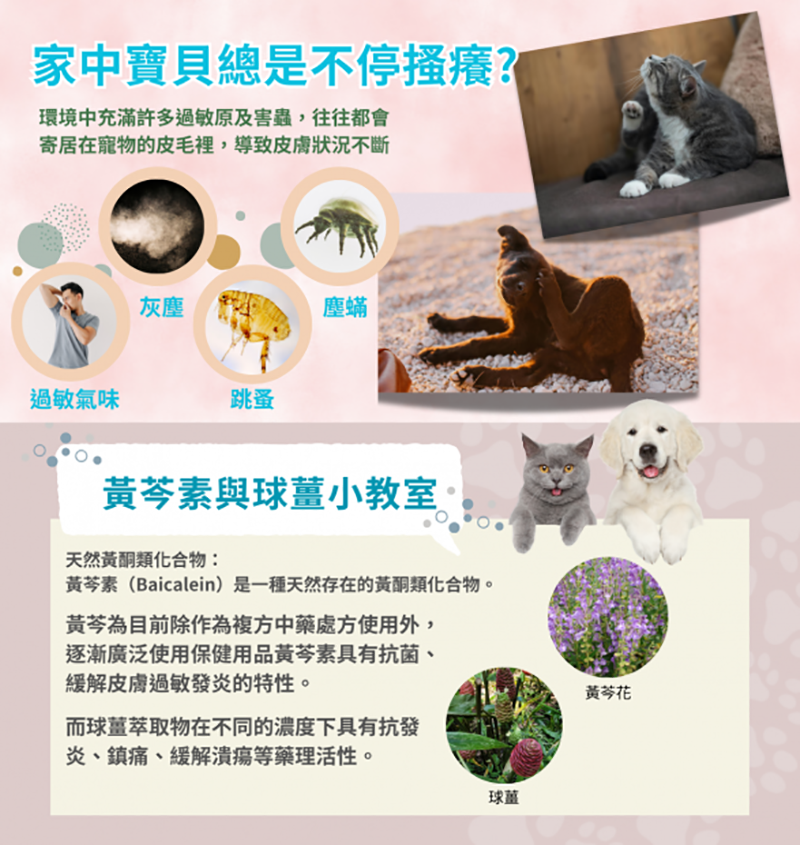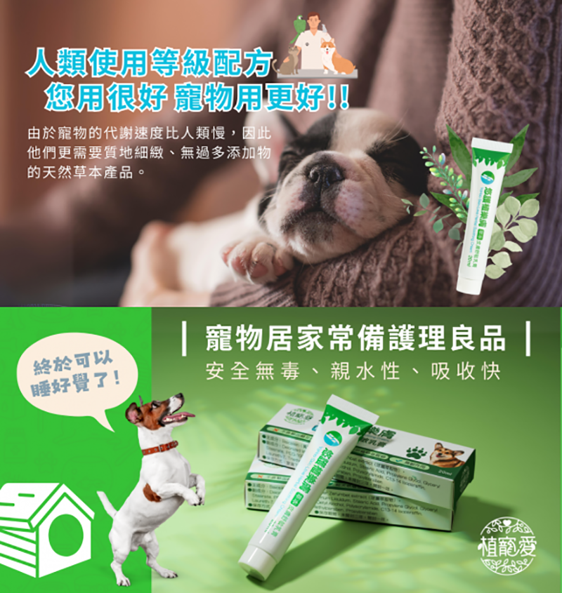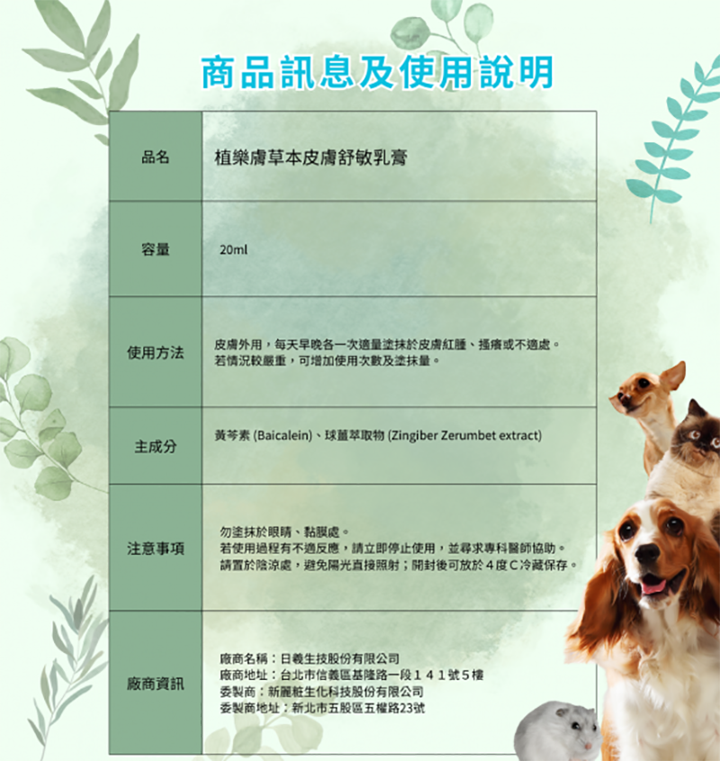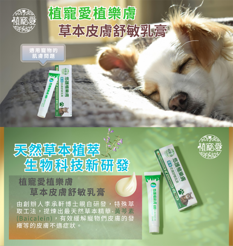 ☑取自台灣花蓮栽種的黃芩,萃取出珍貴的黃芩素(Baicalein)成分,為寵物製成天然無副作用的草本皮膚外用乳膏。
