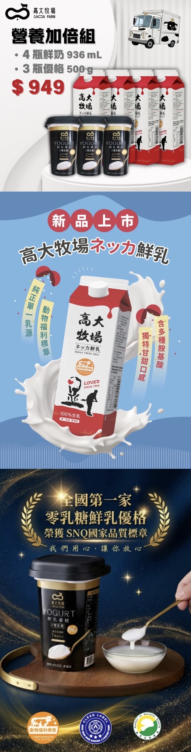 ☑高大牧場鮮奶4罐+優格3罐,營養加倍,滿滿鈣質與益生菌,強化骨骼與腸道健康。