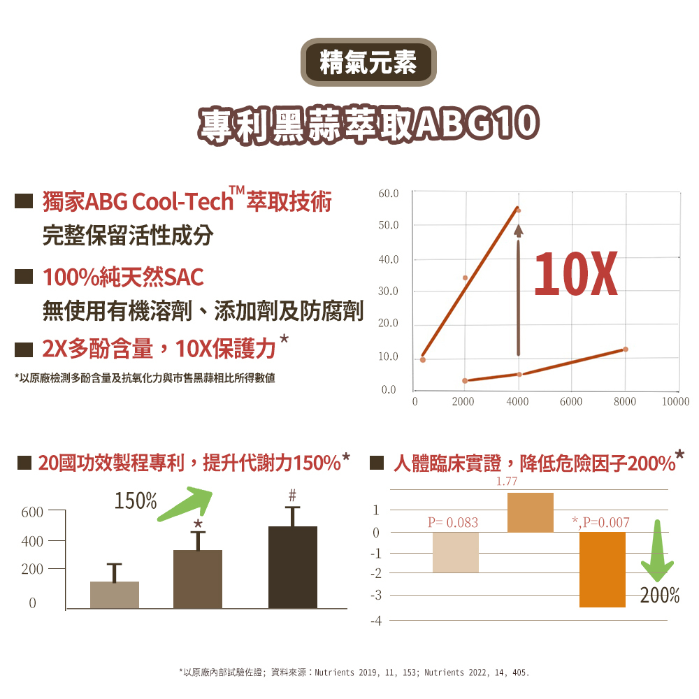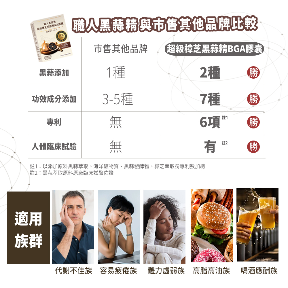 獨家黑蒜精BGA配方,雙黑蒜發酵精華(BG)+高濃縮活性樟芝(A),