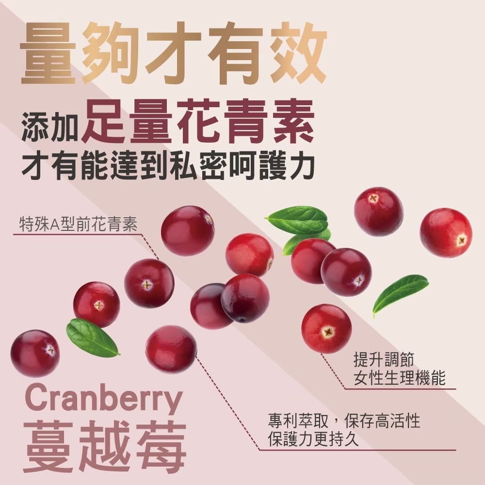 1. 嚴選美國專利Crantive蔓越莓原料,100%全果冷壓製程,最佳比例高度濃縮。