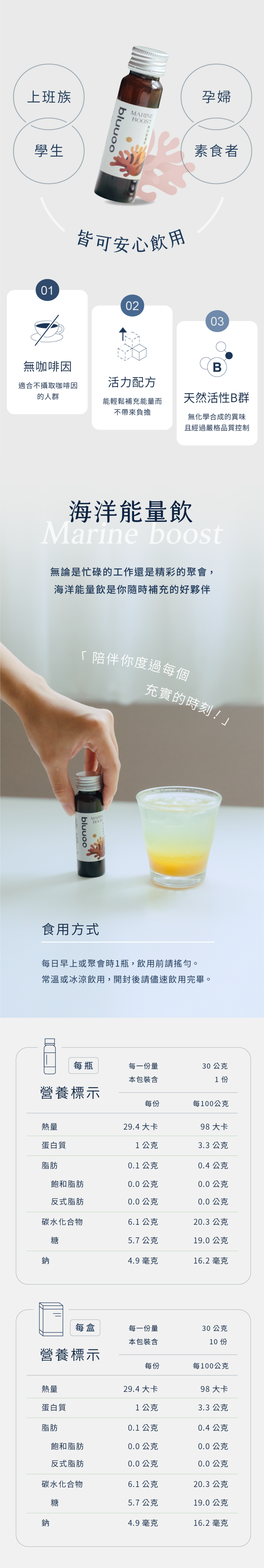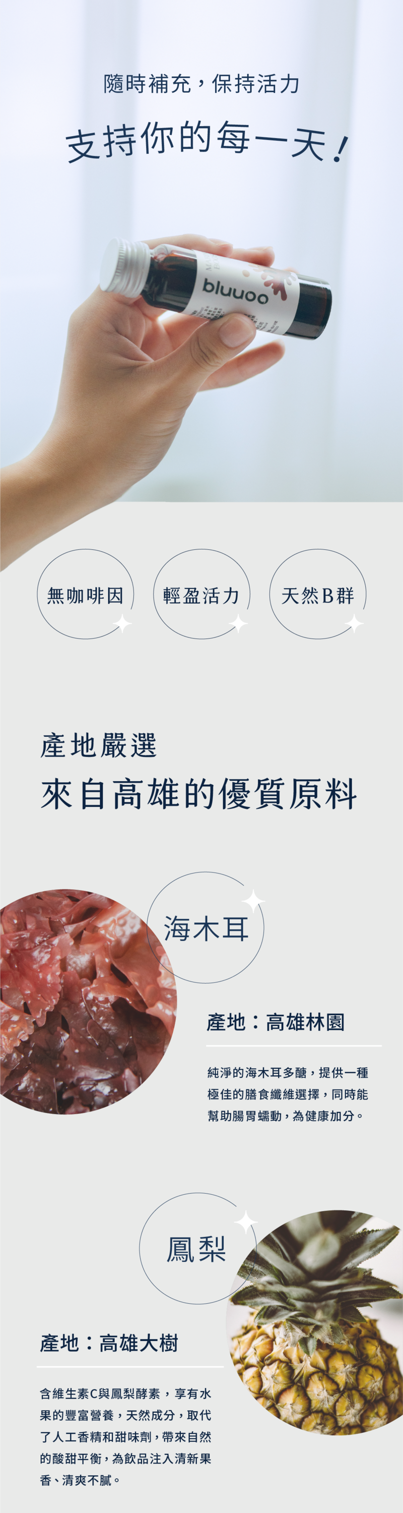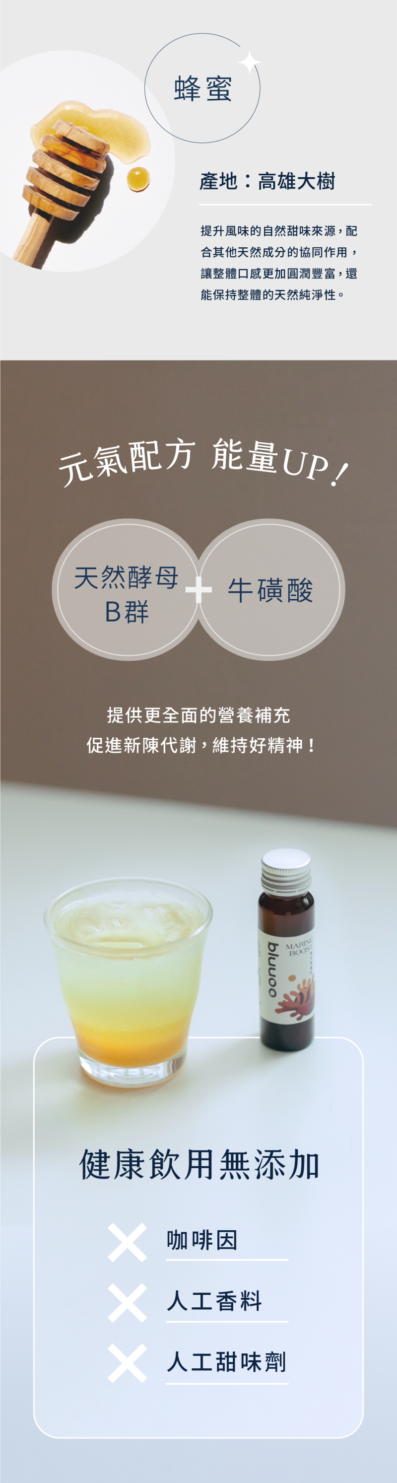 嚴選自高雄的優質原料,融合了來自純淨林園的海木耳多醣、高甜度的大樹鳳梨原汁,以及大樹蜂蜜的自然甘甜。搭配天然酵母萃取的B群和牛磺酸,為日常提供營養補給。無論是忙碌的工作還是精彩的聚會,海洋能量飲是你隨時補充的好夥伴,陪伴你度過每個充實的時刻!