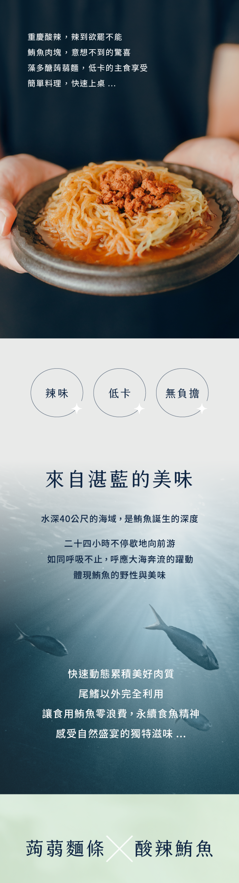 ◆真的東港鮪魚在裡頭!喜歡辣味的你不能錯過,藻多醣蒟蒻麵和重慶酸辣鮪魚碰撞味蕾,平淡與強烈的完美融合,感受美食的豐富滋味。