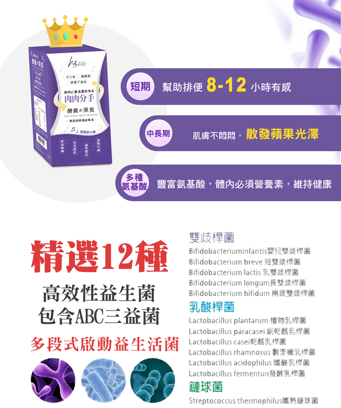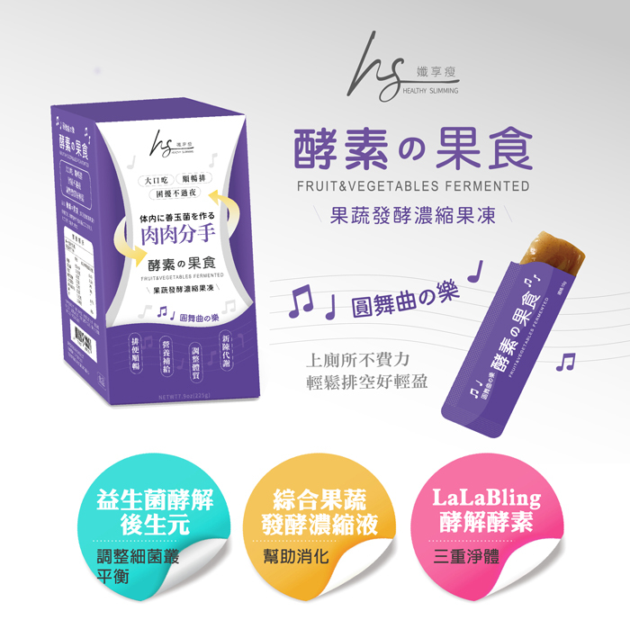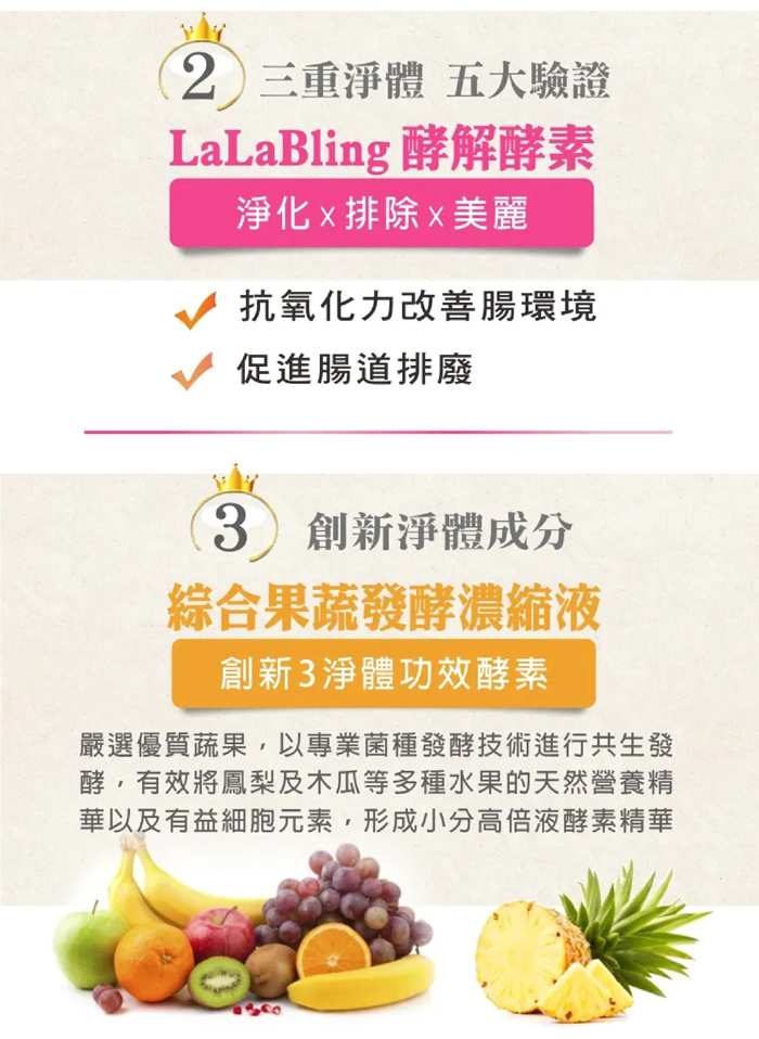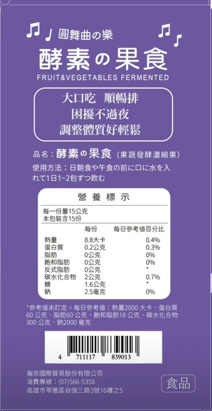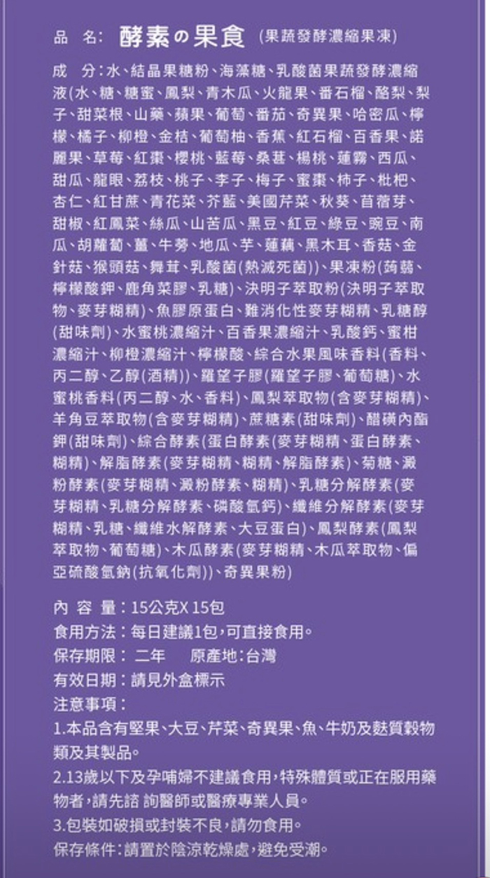【主要成分】水、結晶果糖粉、海藻糖、乳酸菌果蔬發酵濃縮液、果凍粉、決明子萃取粉、魚膠蛋白、難消化性麥芽糊精、乳糖醇、水蜜桃濃縮汁、百香果濃縮汁、乳酸鈣、蜜柑濃縮汁、柳橙濃縮汁、檸檬酸、綜合水果風味香料、羅望子膠、水蜜桃香料、鳳梨萃取物、