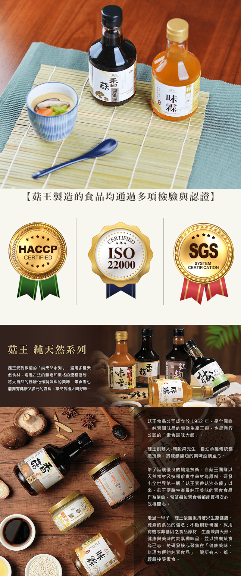 不含柴魚成份,素食者也可享受高品質甘醇的香菇醬油